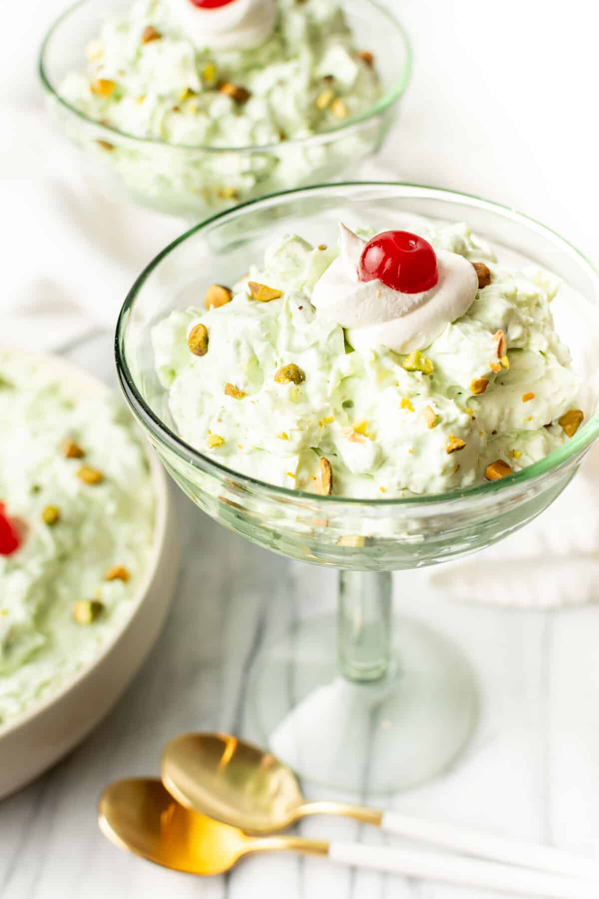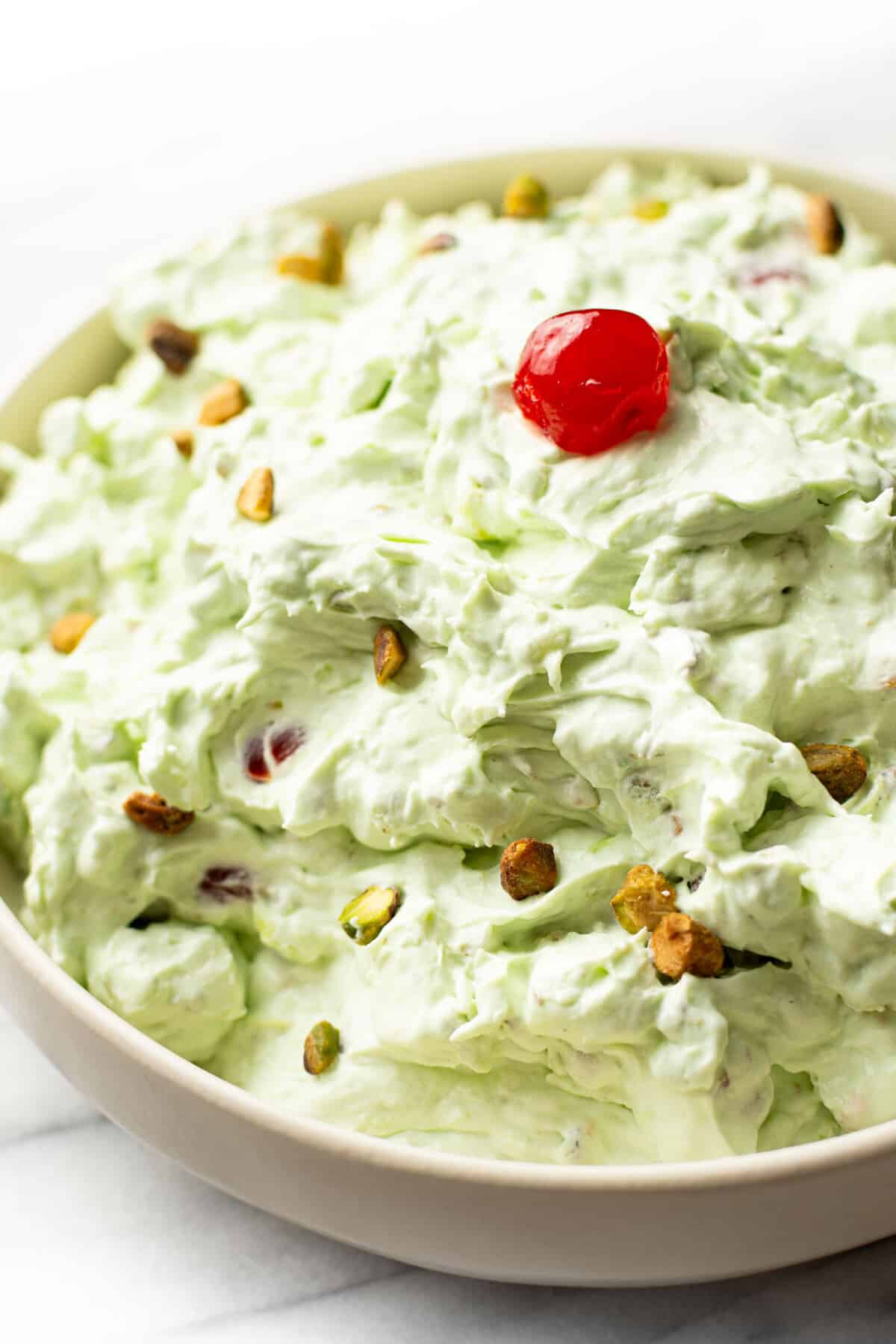 Other names it goes by are green fluff, green goop, shamrock salad, shut the gate salad, mean greens, pistachio delight, and green stuff, all of which are charming as well. Whatever you call this dessert, it’s perfect for your next potluck or family gathering!